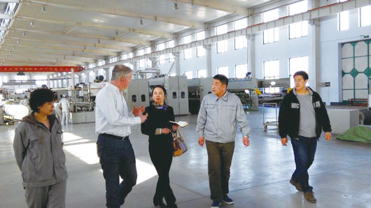 张熠等公司相关工作人员陪同英国外商一行对土工合成材料生产车间、生产线、企业文化等进行了讲解。首先,张熠总经理简要介绍了公司概况,并陪同来访外宾参观了热复合、无纺与淋膜生产线,介绍了公司新设备情况,对产品进行了观摩,产品质量得到了外商的高度肯定。外商在仔细考察后,认真询问我公司目前技术及生产产品的国内现状。