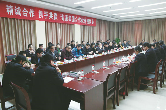 律回春晖渐,万象始更新。岁末之际,为了更好地盘点已经过去的2014年,合作伙伴进一步了解集团的发展战略,与更多客户建立战略联盟关系,同时回馈广大合作伙伴一直以来的追随与支持,集团公司精心准备,于2014年12月28日在商务中心九楼西会议室和天堂寨生态园分别举行了清源集团合作伙伴座谈会以及“风雨之后见彩虹”银企联谊会暨合作伙伴感恩答谢会,共同历数收获与辛酸,共商合作与未来。临淄区区委常委、副区长卢华栋同志,齐鲁化学工业区招商局副局长、金岭回族镇党委书记于少华,集团董事长马之清,以及各家金融机构,集团客户代表,供应商朋友,施工单位代表及媒体朋友共同出席了此次会议。