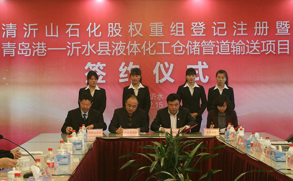 2015年2月15日,“清沂山石化股权重组登记注册暨青岛港至沂水县液体化工仓储管道输送项目签约仪式”在沂水县清沂山石化三楼会议室隆重举行,开启了集团与多方合作共赢、共同发展的美好明天。沂水县委常委、常务副县长吴恩坤,青岛港集团有限公司总裁成新农,山东清源集团有限公司董事长马之清,青岛港国际股份有限公司业务部部长王军,青岛实华原油码头有限公司总经理刘洪财,二连市高陆对外经济贸易有限责任公司总经理张晓巍、副总经理史文化和郭云海等政府及合作方领导,以及淄博建设银行,沂水县工商银行、中国银行、农业银行和建设银行等金融机构共同出席了此次签约仪式,见证这一多方结盟、战略合作的庄严时刻。正本物流有限公司董事长王洪敏、集团总经理焦冲、石化三分厂董事长徐建凤等集团领导也出席了此次会议。此次签约仪式由沂水县政府党组成员、庐山化工园区副指挥熊伟明主持。