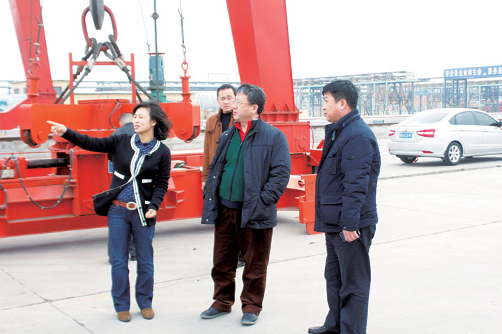在为公司集装箱业务配置的航吊现场,王总向客人们介绍了企业的发展情况和下一步集装箱运输发展的计划,她说我们的集装箱业务开通不久,尚处在市场的开拓期和业务的磨合期,公司对集装箱业务的目标和要求是高的,要打造当地集装箱中转基地,实现内陆到港口双向联接。