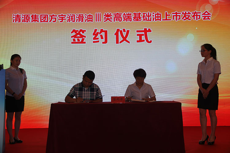 品质的提升,给清源集团带来了合作的突破。中国石化润滑油有限公司天津分公司和江苏高科石化股份有限公司在详细了解清源集团方宇润滑油新产品情况后,全面认可了新产品的品质和意义,对未来的合作前景充满信心,并当场与清源集团进行合作签约,清源集团总经理助理、销售分公司总经理张红梅女士分别与中国石化润滑油有限公司天津分公司和江苏高科石化股份有限公司签署基础油合作协议。随后,各位嘉宾在楼前合影留念,共同祝贺此次发布会圆满成功。