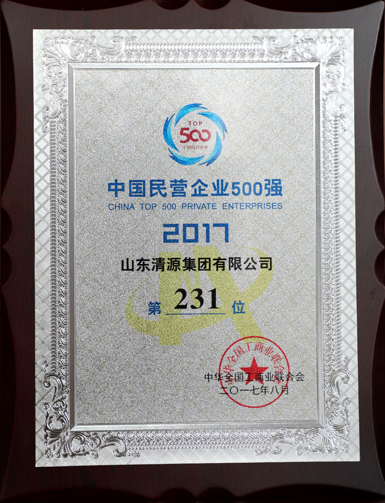 8月24日,2017中国民营企业500强在济南发布。此项活动由全国工商联主办、山东省人民政府承办,工业和信息化部、国家工商总局、中国民生银行支持。全国政协副主席、全国工商联主席王钦敏,山东省委副书记、省长龚正,工业和信息化部原党组成员、中央纪委驻部纪检组原组长金书波分别致辞,中央统战部副部长、全国工商联党组书记、常务副主席徐乐江发布榜单,全国工商联副主席黄荣发布分析报告,国家工商总局副局长、党组成员王江平出席,全国工商联党组副书记、副主席樊友山主持。山东共有57家企业入榜,山东清源集团有限公司以营业收入2,383,193万元位列第231位,成为临淄区内唯一一家入榜企业。