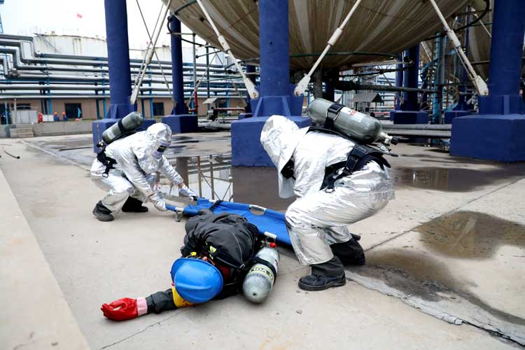 本次演练场地设在方宇润滑油储运车间,演练模拟储运车间液化石油气储罐运行过程中,罐底出料管线法兰泄漏,事故处置中造成1人受伤,第一时间应急响应,组织开展抢险应急救援行动。9点10分演习开始,演习模拟人员发现控制室内DCS显示可燃气报警器报警,事故区烟雾弥漫,两名外操人员立即到现场查看,发现Q-108#号液化石油气罐出料管线法兰泄漏,两名外操人员在紧固法兰螺栓时,法兰螺栓突然断裂,大量液化石油气泄露,一名外操人员撤离时受伤倒地,另一人安全撤离。当班班长按照现场处置方案进行处置,外操人员穿防火防化服、佩戴好空气呼吸器,携带担架现场救人。车间主任立即命令向120报警,装置无关人员紧急疏散,现场应急广播响起。消防车使用喷雾状水掩护救人,同时,外操携带F扳手关闭雨排阀,防止事故水外排,内操人员也在短时间内启动了紧急停车程序。